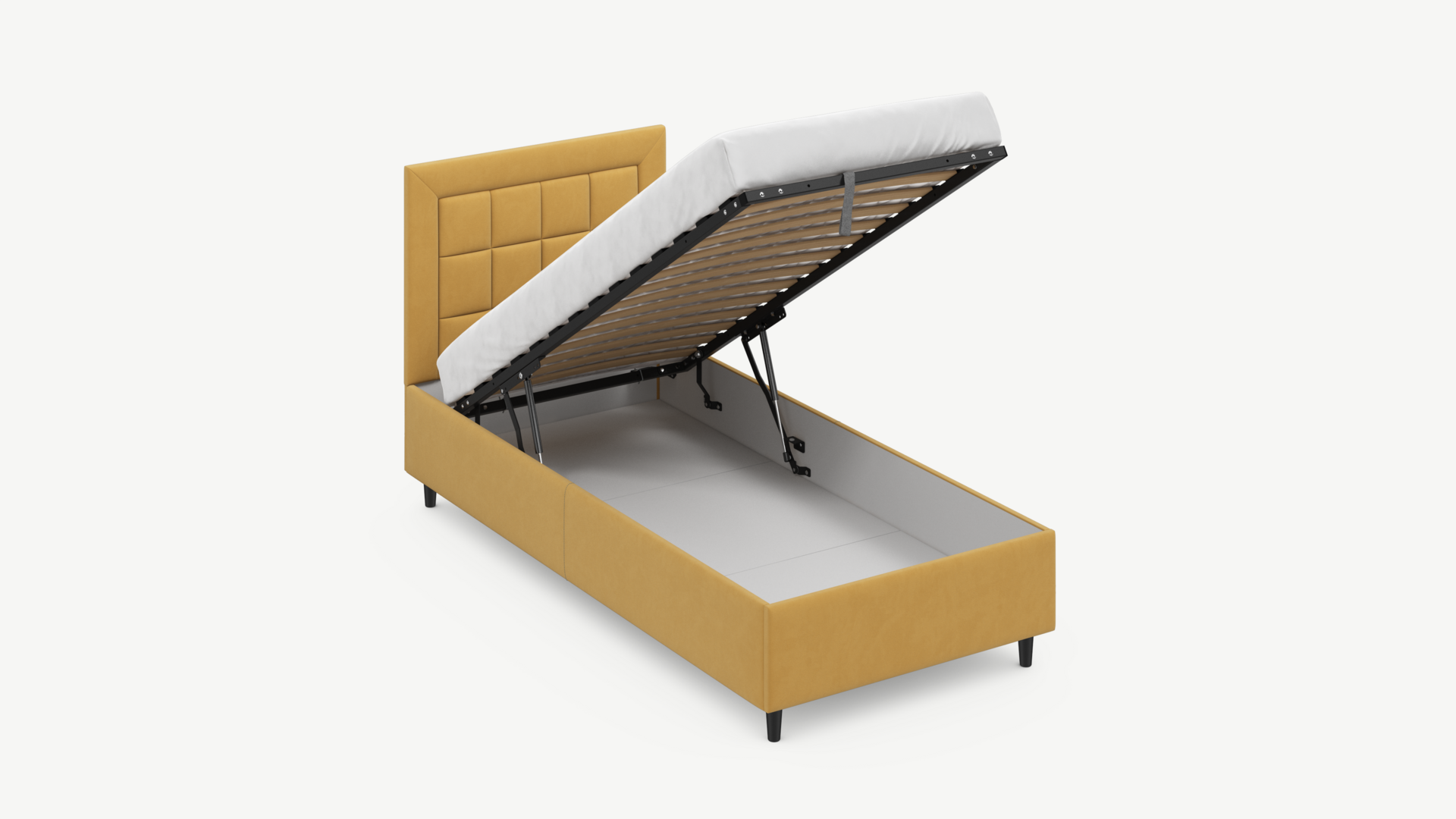 • Скрытая под основанием вместительная емкость без внутренних перегородок позволяет использовать всю площадь подкроватного пространства для хранения вещей.