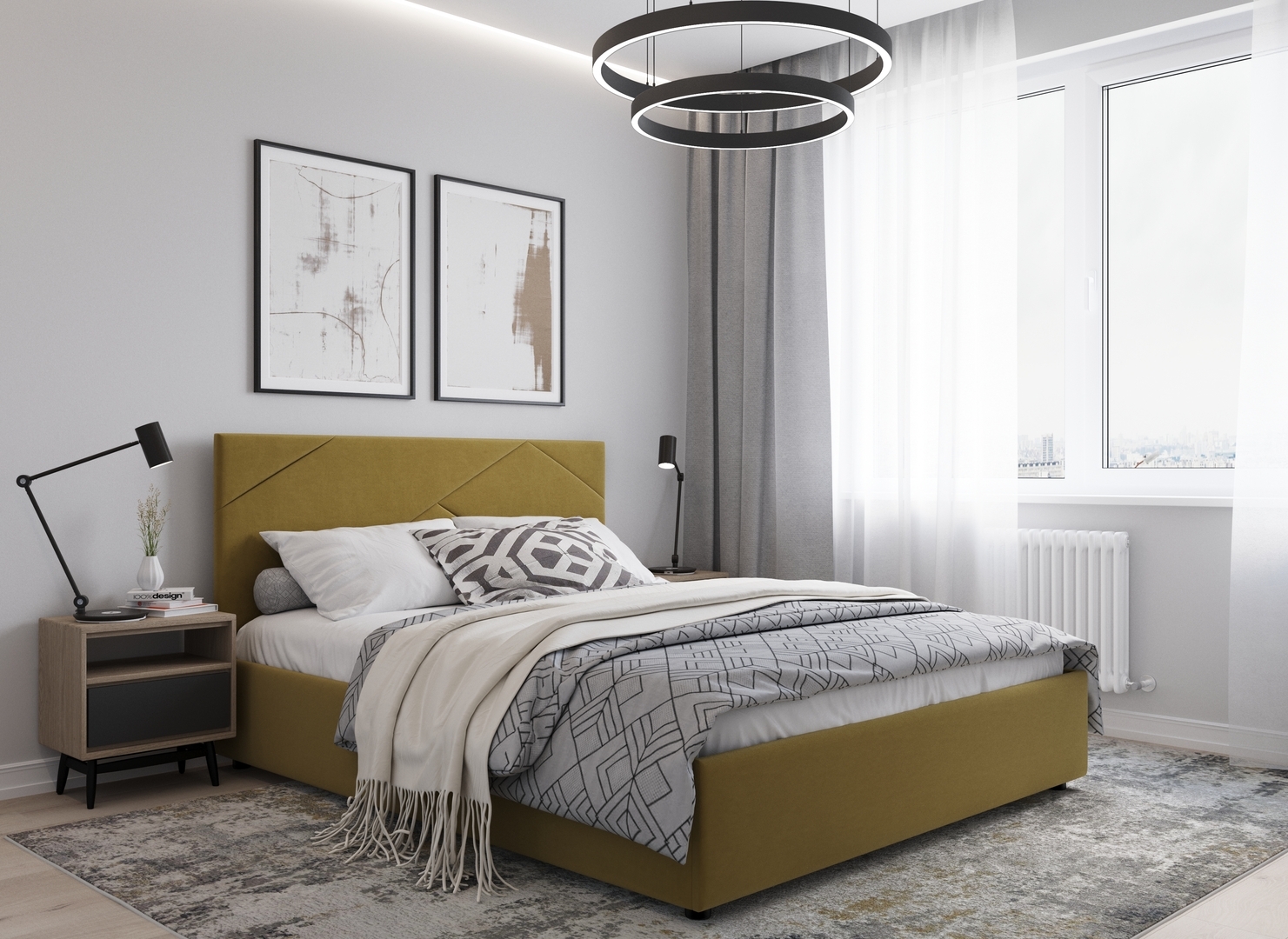 MOON FAMILY 1257 привлекает внимание оригинальным исполнением: широкие полосы ткани эффектно пересекают периметр изголовья, создавая на нем графический орнамент. Элегантным и практичным акцентом служат скрытые карманы, расположенные по его углам. Лаконичные формы объемных царг создают единый гармоничный образ и фокусируют внимание на центральном текстурном элементе кровати.