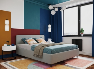Царга, задающая пропорции, благодаря гладкости своей фактуры подчеркивает центральный элемент декора. Высокие опоры приподнимают фигуру кровати над полом и добавляют её образу визуальной легкости.