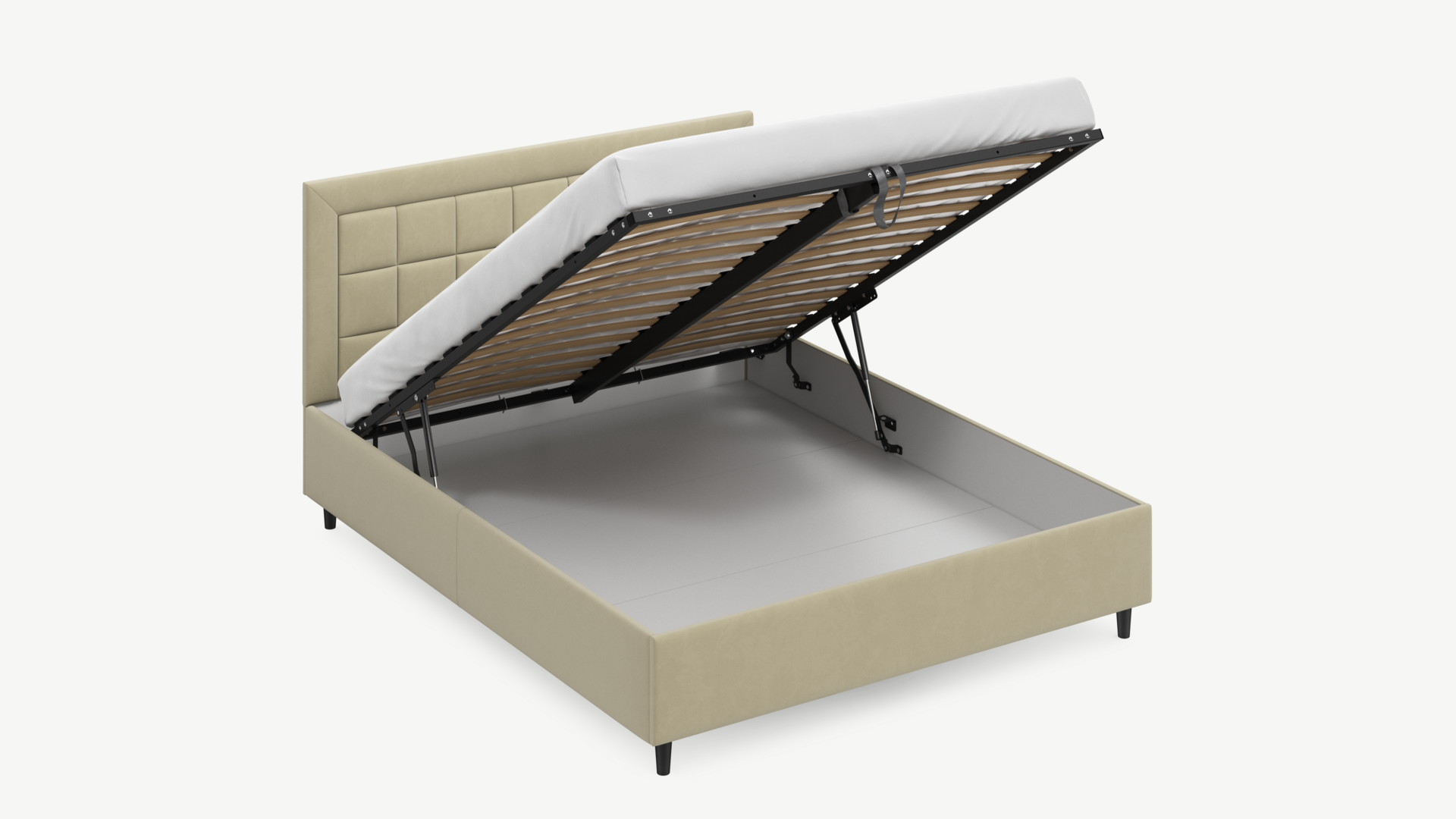Вместительная емкость под кроватью без внутренних перегородок позволяет использовать для хранения вещей 100% пространства.