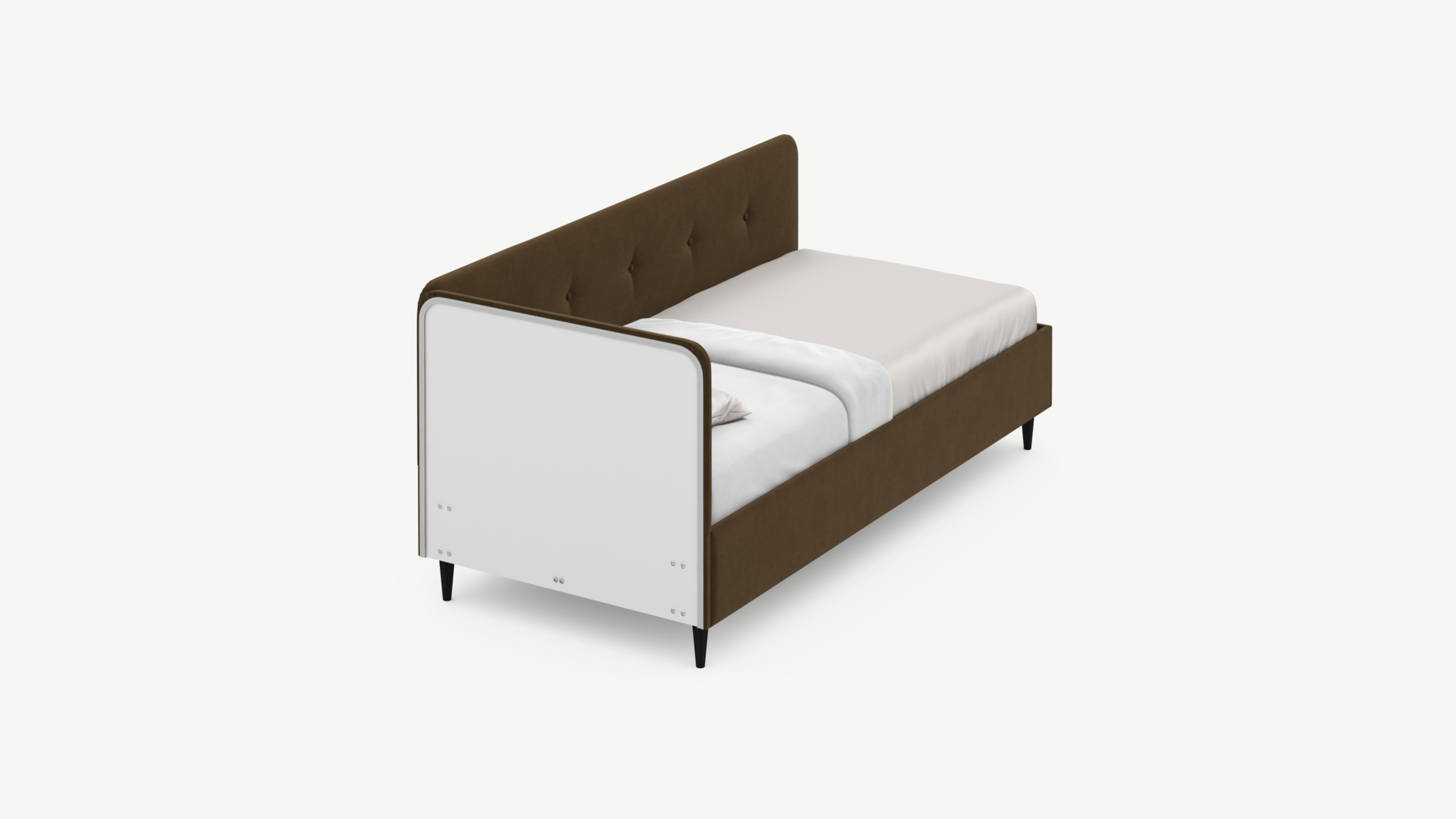 Угловая односпальная кровать MOON FAMILY 1253 с мягкой спинкой и изголовьем обладает округлыми формами, привносящими в интерьер нотки нежности. Изголовье, украшенное пуговицами, добавляет окружающему пространству шарм и уют. Высокие опоры придают кровати визуальной легкости, а также обеспечивают удобство во время уборки.