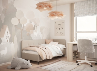 Угловая односпальная кровать MOON FAMILY 1253 с мягкой спинкой и изголовьем обладает округлыми формами, привносящими в интерьер нотки нежности. Изголовье, украшенное пуговицами, добавляет окружающему пространству шарм и уют. Высокие опоры придают кровати визуальной легкости, а также обеспечивают удобство во время уборки.