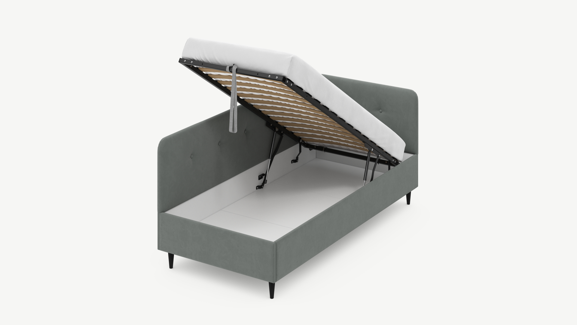 • Скрытая под основанием вместительная емкость без внутренних перегородок позволяет использовать всю площадь подкроватного пространства для хранения вещей.